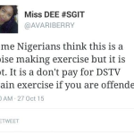 Beat FM OAP & writer Dami doesn’t believe that the National Broadcasting Commission urging Multi choice, the parent company of DSTV, not to air transgender programme “I am Jazz” because they feel the programme is capable of corrupting the youths as it is also at variance with Nigerian law which prohibits homosexuality. She shared her thoughts on the matter on twitter…