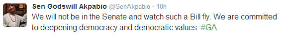 Senate Minority Leader and former governor, Godswill Akpabio says the rumored social media bill will never pass in the senate. See more of his tweets after the cut…