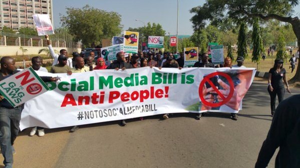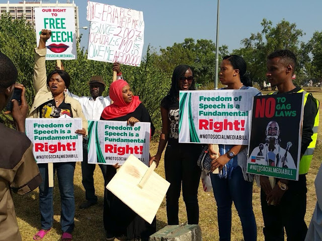 In protest of the Social media bill “Frivolous Petitions (Prohibitions, Etc.) Bill, 2015″ sponsored by Senator Bala Ibn Na’Allah, the Deputy Senate Leader, Nigerian social media activists on Tuesday, stormed the National Assembly, Abuja, for a rally tagged #NoToSocialMediaBill.