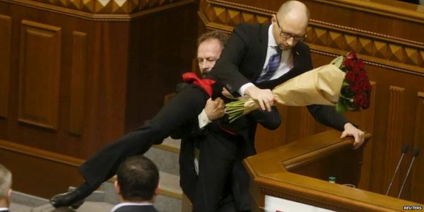 According to Voice of America,Yatseniuk was defending his embattled government’s record when lawmaker Oleh Barna walked over to him, presenting him sarcastically with a bunch of red roses. Barna then grabbed him around the waist and groin, lifting him off his feet and dragging him from the rostrum.