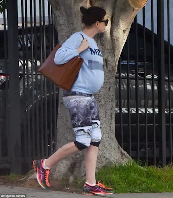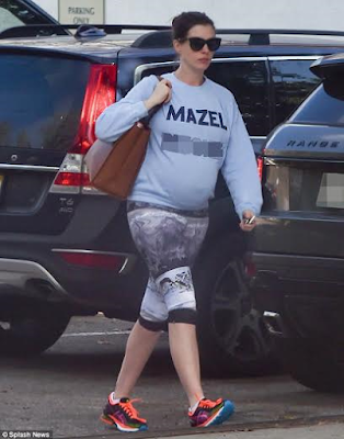 Anne Hathaway was pictured heading to a gym in West Hollywood yesterday with her baby bump on display. The 33-year-old showed off her bump in a grey slogan-printed jumper and also wore cropped monochrome leggings. Another photo after the cut…
