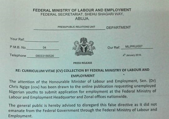 LOL….The Federal Ministry of Labor and Productivity has issued a circular asking Nigerians to stop sending their Curriculum Vitae to their ministry as they are not employing anyone presently. Read the statement above and the rest after the cut…