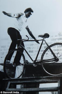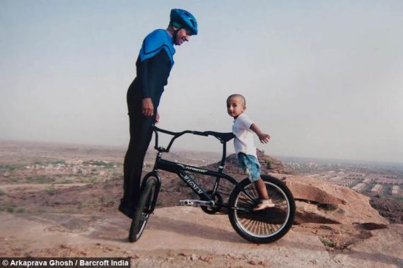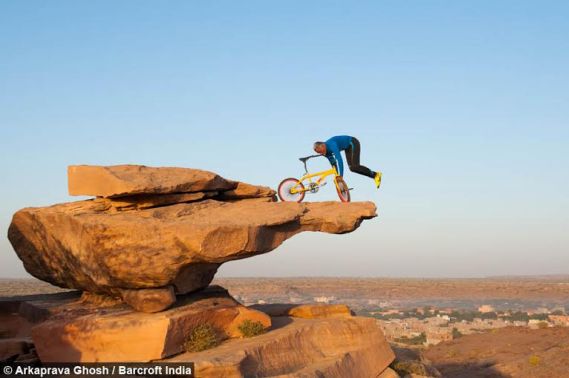 Khiv Raj Gurjar, from Jodhpur in the Indian state of Rajasthan, has taken extreme yoga to new heights – literally. He spends an hour each day striking yoga poses on a bicycle perched precipitously on the edge of a 300ft cliff.