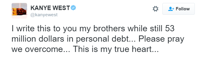 The ”genius”(I really think he is) took to twitter to explain the meaning of his album, The Life of Pablo, saying it means the Life of Paul. He then said just like Paul,he is consumed by his purpose to help the world. He then revealed he is writing this while still 53 million dollars in personal debt.