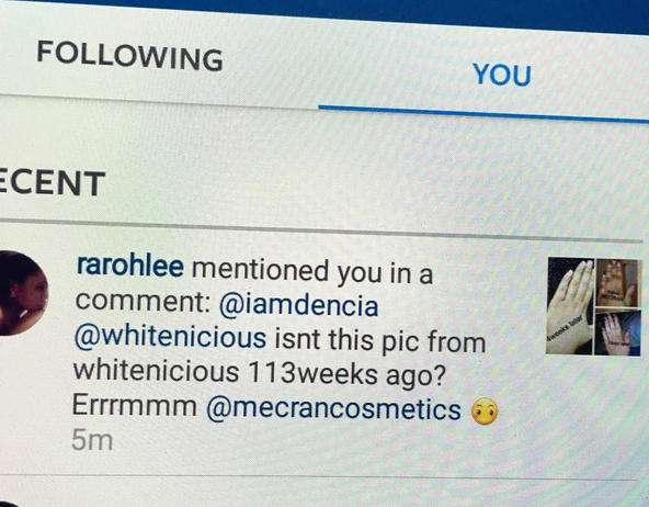 Dencia of a photo by a cosmetic company in which Toke Makinwa is the brand ambassador, called Mecran Cosmetics. (see my post here) Now, the problem is that, they used a before/after Whitenicious image, and passed it off as theirs.    Whitenicious called them out and they deleted the image.
