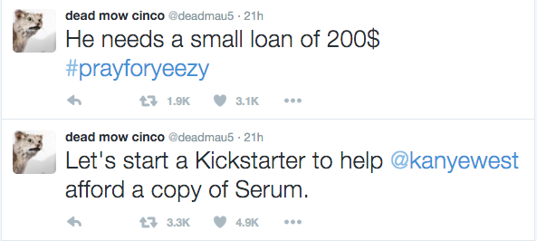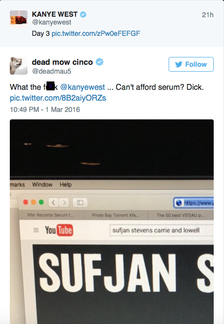 So here’s what caused the fight. Two days ago, Kanye exposed himself on twitter by displaying web browsers showing he was using bootleg music programs and illegal file sharing sites. One of the creators of the music program, Deadmau5 called Kanye out for bootlegging his program and started a Go Fund Me Account for a ‘broke’ Kanye who can’t afford the legal ones. Kanye came for him…and Deadmau5 clapped back. Read the sweet drama after the cut…