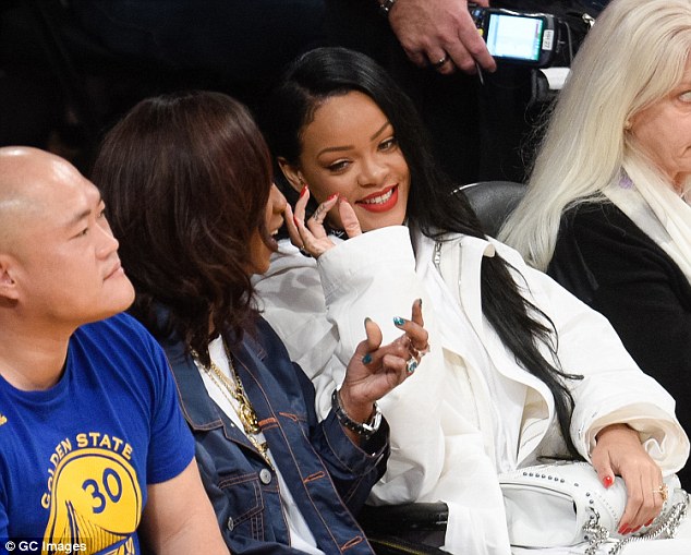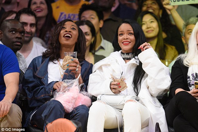 Rihanna was seen at the Staples Center to watch the game between LA Lakers and the Golden State Warriors in an all white ensemble. She was seen enjoying herself with a gal pal during the game. More photos after the cut…