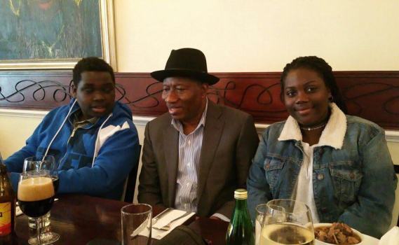 Former president Jonathan pictured on an outing with his kids, Ariwera (to his right) and Aruabai at 805 restaurant, in London yesterday…