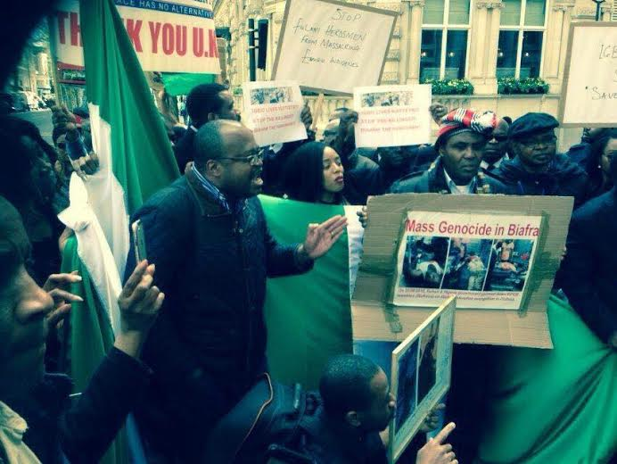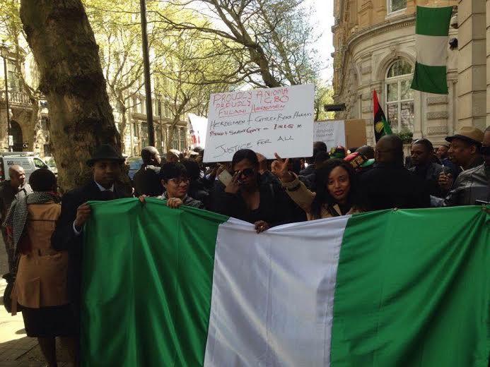 Nigerians residing in London are presently staging a protest over the increasing rate of herdsmen attack in some parts of Nigeria. Carrying placards with various inscriptions, the Nigerians are calling for a quick intervention by the Federal government. More photos after the cut…