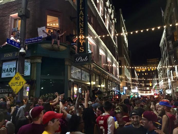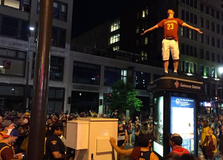 Ecstatic fans flooded the streets of Cleveland, scaling buildings, buses and a lone fire truck after the Cavaliers won their first NBA championship since 1964, last night. People gathered outside Quicken Loans Arena, home of the Cavaliers, and celebrated after watching Lebron James lead Cleveland to a 93-89 Game 7 victory over the Golden State Warriors. More photos and video after the cut.
