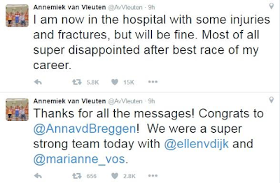 Annemiek van Vleuten, a female Dutch Cyclist at the Rio Olympics is in intensive care after she lost control ten kilometers from the finish line in a race that she was leading and flew head over heels, smacking her head into the concrete gutter by the side of the road. A freak accident that has left her with three cracks on her spinal cord and severely concussed.