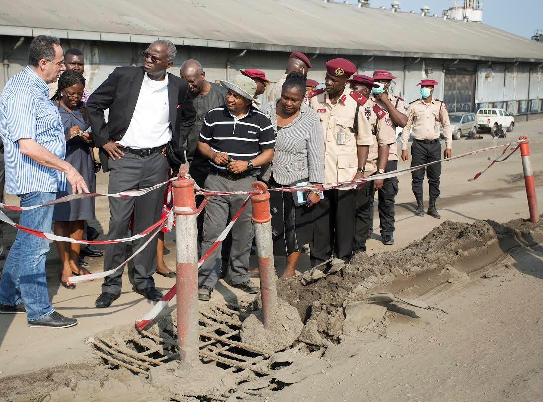 Hon Minister of Power, Works & Housing, Mr Babatunde Fashola, SAN (middle), Federal Controller of Works, Engr. Godwin Eke (right) and Managing Director of Buildwell Plants & Equipment Industries Ltd, Engr. Georges Mohanna(middle) during the Minister’s inspection of the failed portion of the Apapa-Ijora bridge linking the Apapa Central Business District with Lagos Island in Lagos on Thursday 4, August 2016. More photos after the cut…
