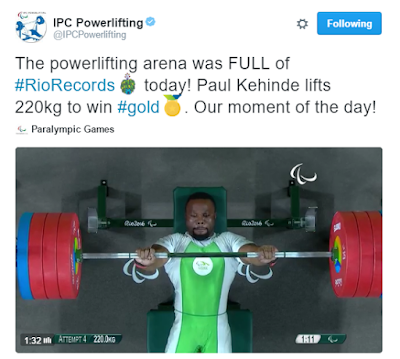 This is GREAT~! Nigeria’s Paul Kehinde has broken the world record with a 220 kg lift in the men’s 65 kg category in power-lifting. Kehinde’s win is Nigeria’s second gold medal at the ongoing Rio 2016 Paralympics.