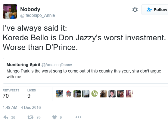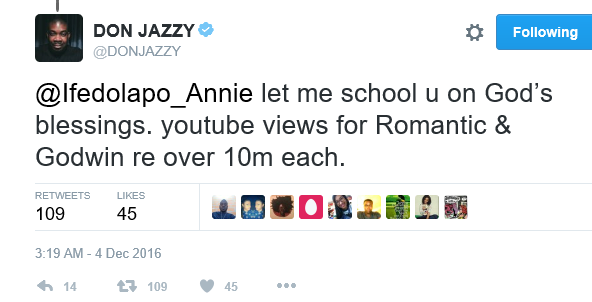 A Twitter user said Korede Bello is Don Jazzy’s worst investment, adding that it was worse than D’Prince. Don Jazzy decided to school the fan on Korede’s worth. More tweets after the cut…