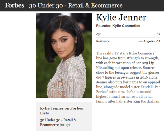 19-year-old Reality TV star, Kylie Jenner has been named on Forbes’ illustrious 30 under 30 list. She’s the youngest person and only teenager to be named in the Retail and Ecommerce category for 2017. She secured her a spot on the list because she’s the founder of Kylie Cosmetics.